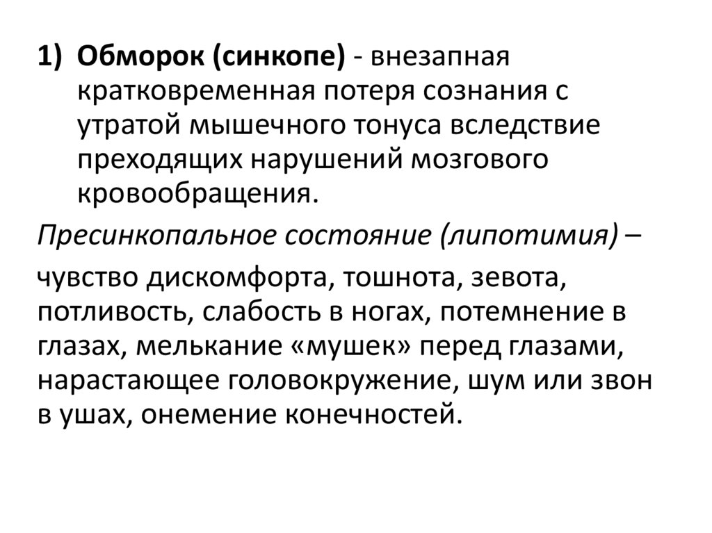 1) Обморок (синкопе) - внезапнаякратковременная потеря сознания с