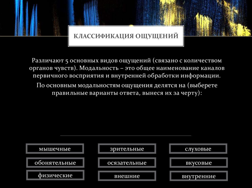 По основным модальностям ощущения делятся на (выберете