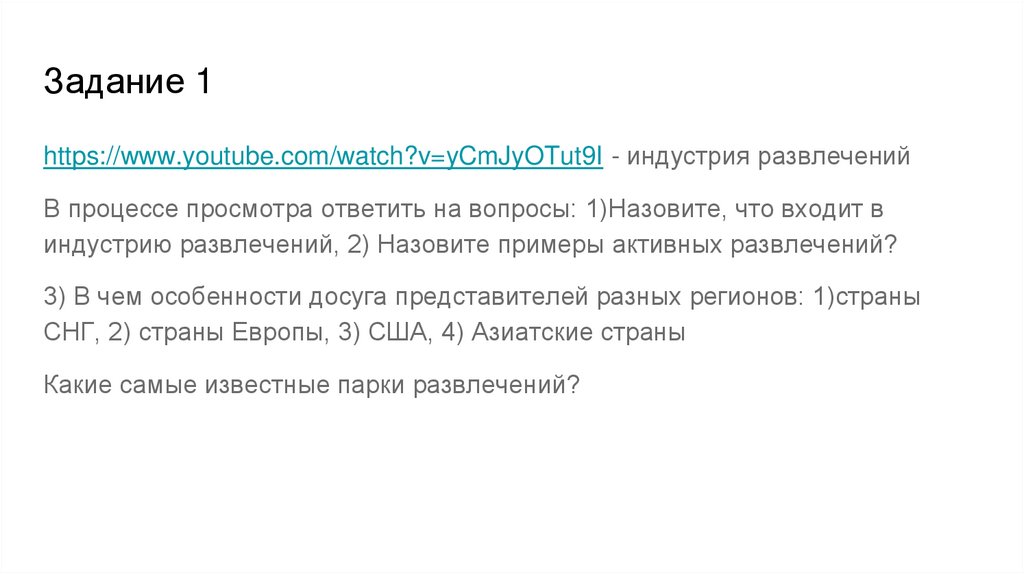 Задание 1https://www.youtube.com/watch?v=yCmJyOTut9I - индустрия развлечений