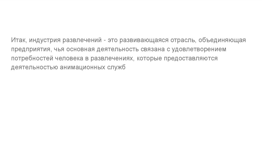 Итак, индустрия развлечений - это развивающаяся отрасль, объединяющаяпредприятия, чья основная деятельность связана с удовлетворением