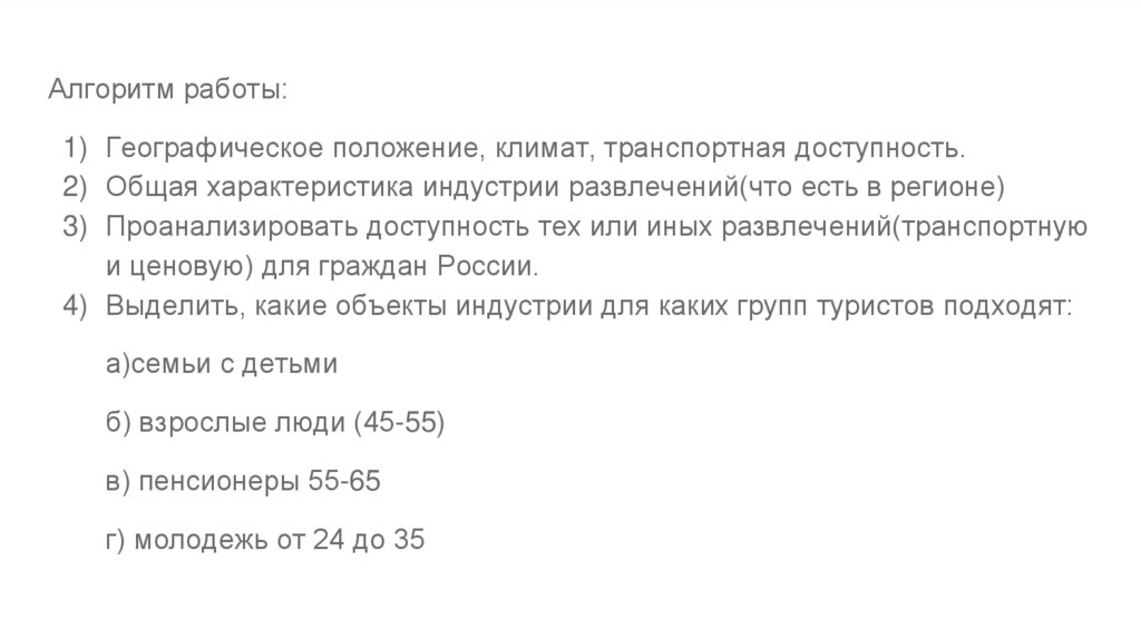 Алгоритм работы:1) Географическое положение, климат, транспортная доступность.