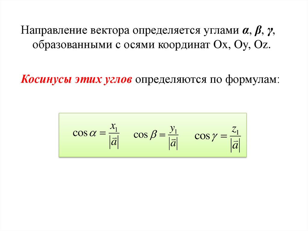 Направление вектора определяется углами α, β, γ,образованными с осями координат Ox, Oy, Oz.