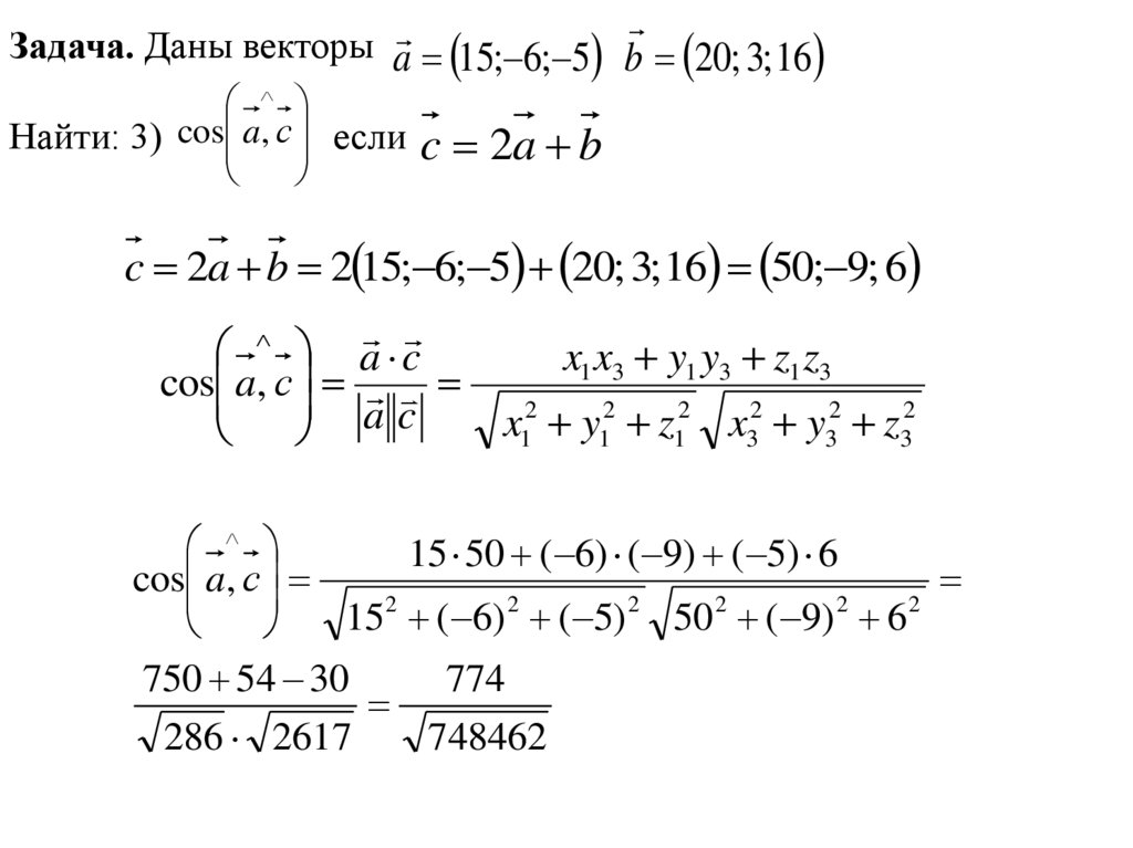 Задача. Даны векторы a 15; 6; 5 b 20; 3; 16Найти: 3) cos a, с если