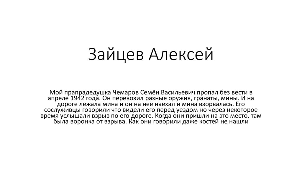 Зайцев АлексейМой прапрадедушка Чемаров Семён Васильевич пропал без вести в