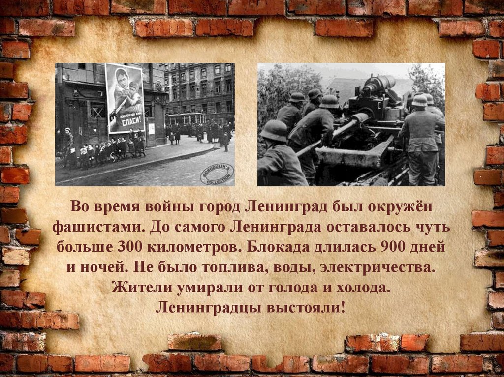 Во время войны город Ленинград был окружёнфашистами. До самого Ленинграда оставалось чуть