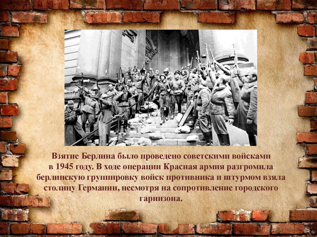 Взятие Берлина было проведено советскими войскамив 1945 году. В ходе операции Красная армия разгромила