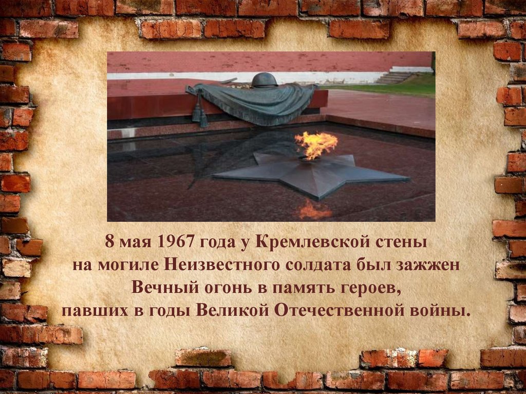 8 мая 1967 года у Кремлевской стенына могиле Неизвестного солдата был зажжен
