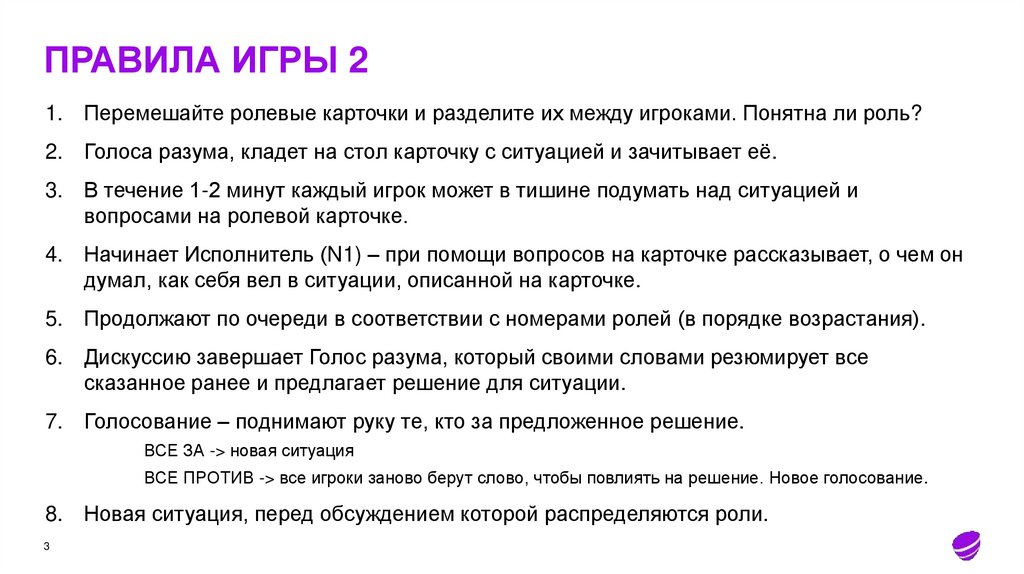 2. Голоса разума, кладет на стол карточку с ситуацией и зачитывает её.