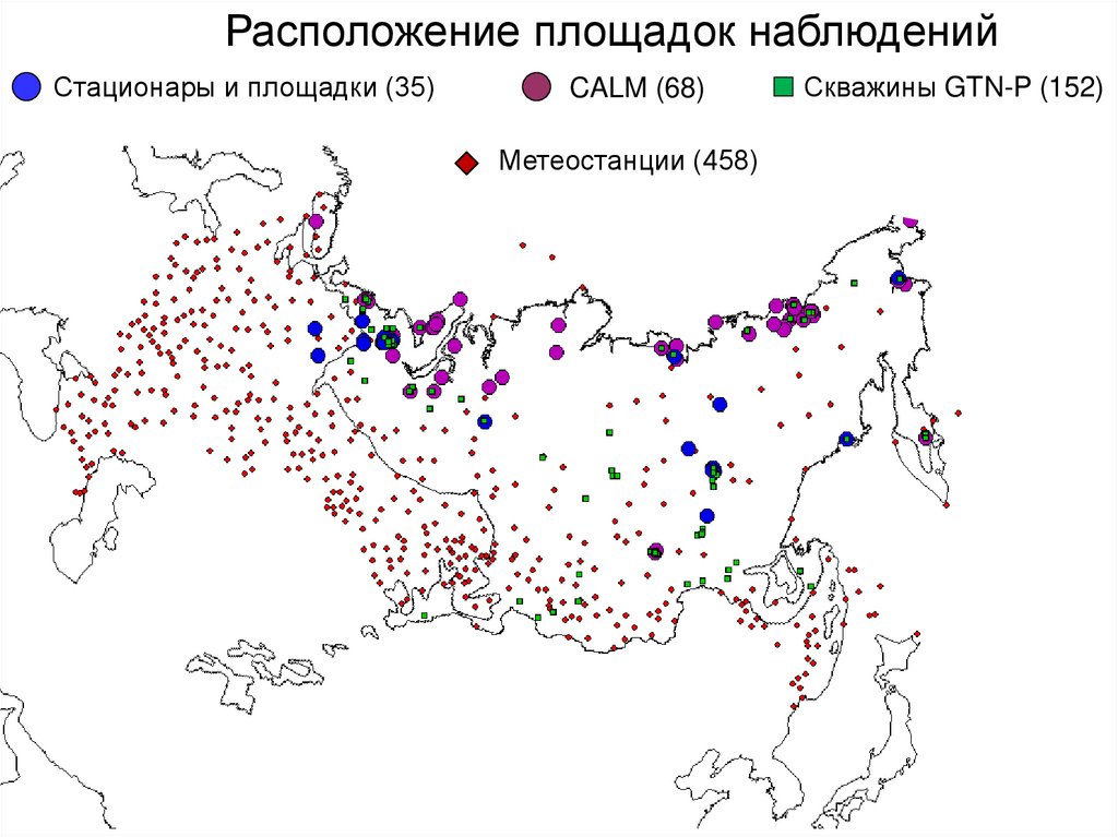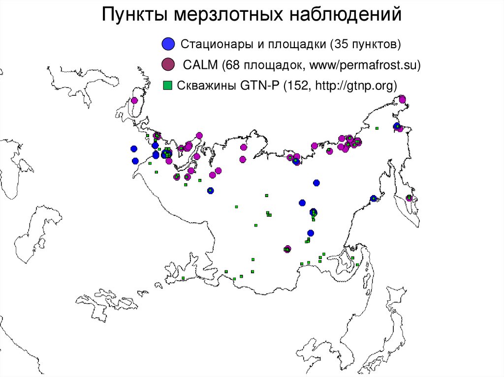 Пункты мерзлотных наблюденийСтационары и площадки (35 пунктов)