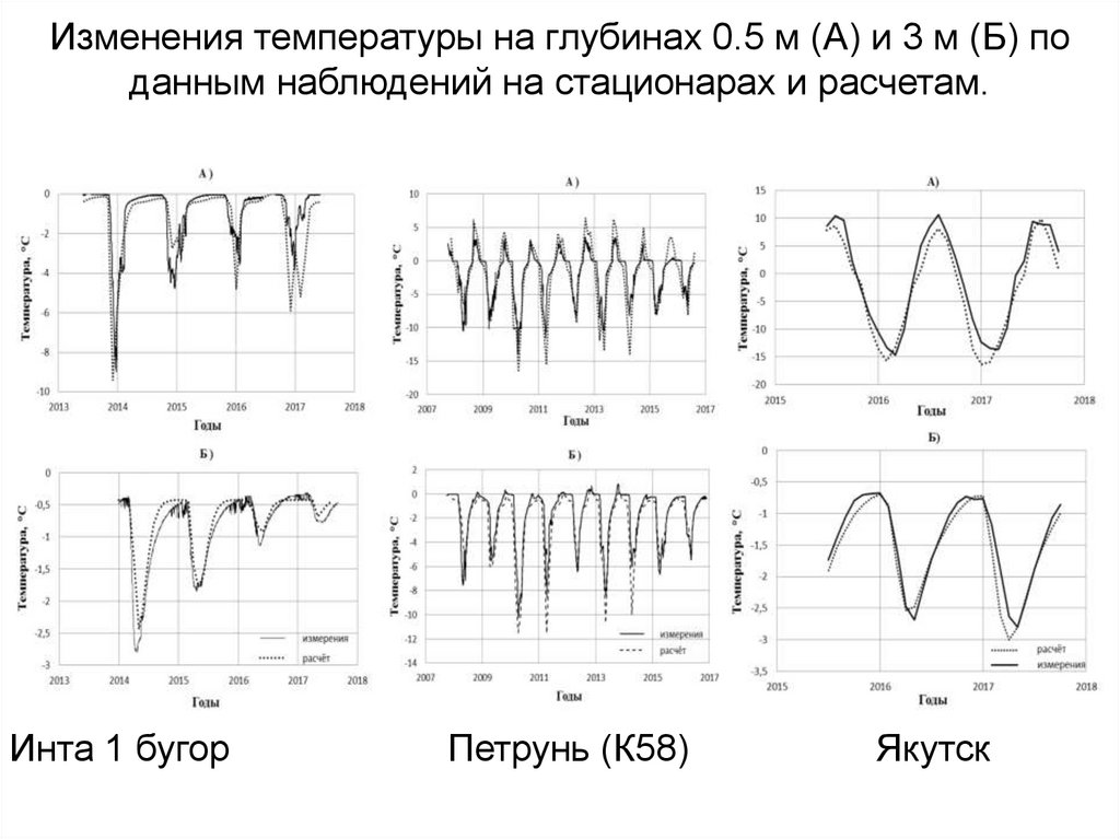 Изменения температуры на глубинах 0.5 м (А) и 3 м (Б) поданным наблюдений на стационарах и расчетам.