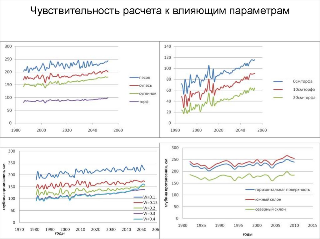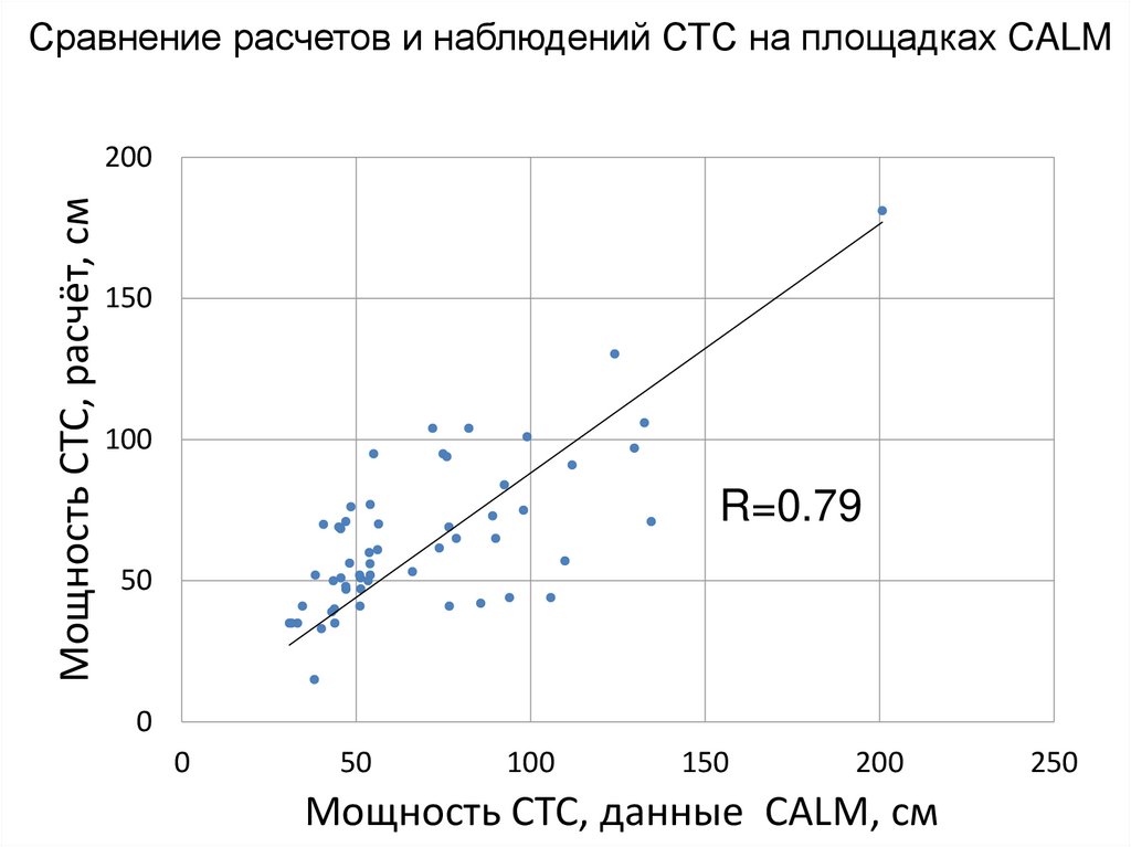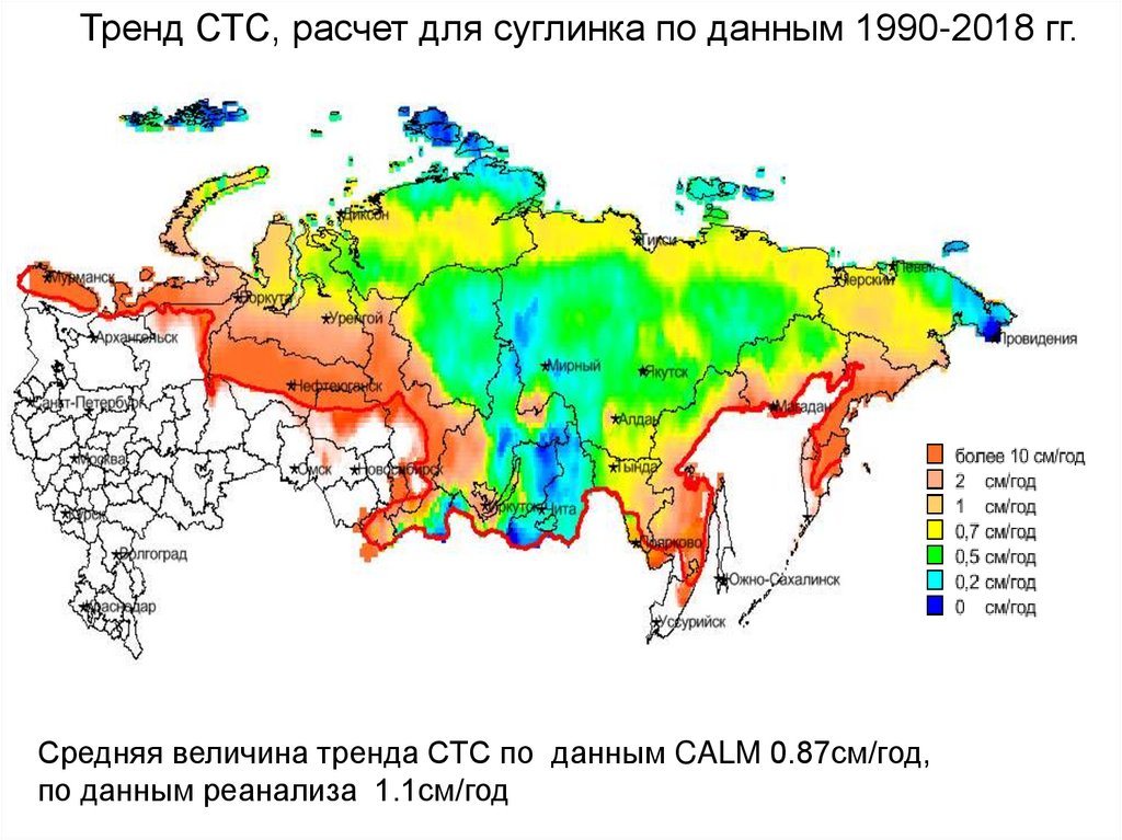 Тренд СТС, расчет для суглинка по данным 1990-2018 гг.Средняя величина тренда СТС по данным CALM 0.87см/год,