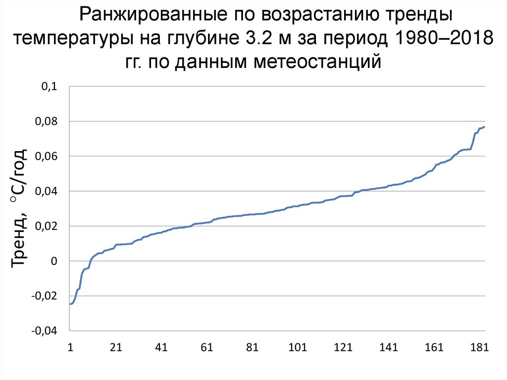 Ранжированные по возрастанию трендытемпературы на глубине 3.2 м за период 1980–2018