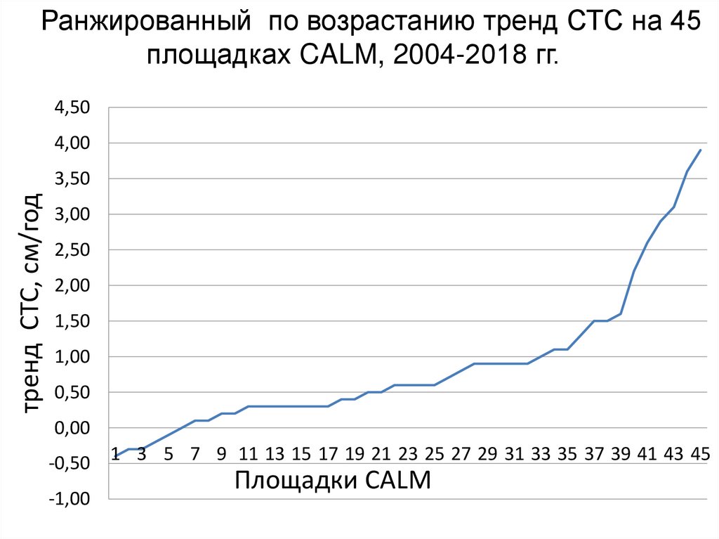 Ранжированный по возрастанию тренд СТС на 45площадках CALM, 2004-2018 гг.