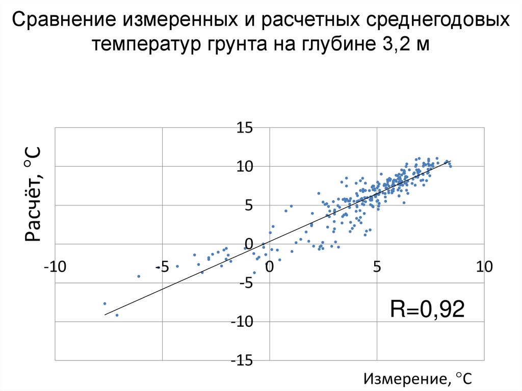 Сравнение измеренных и расчетных среднегодовыхтемператур грунта на глубине 3,2 м