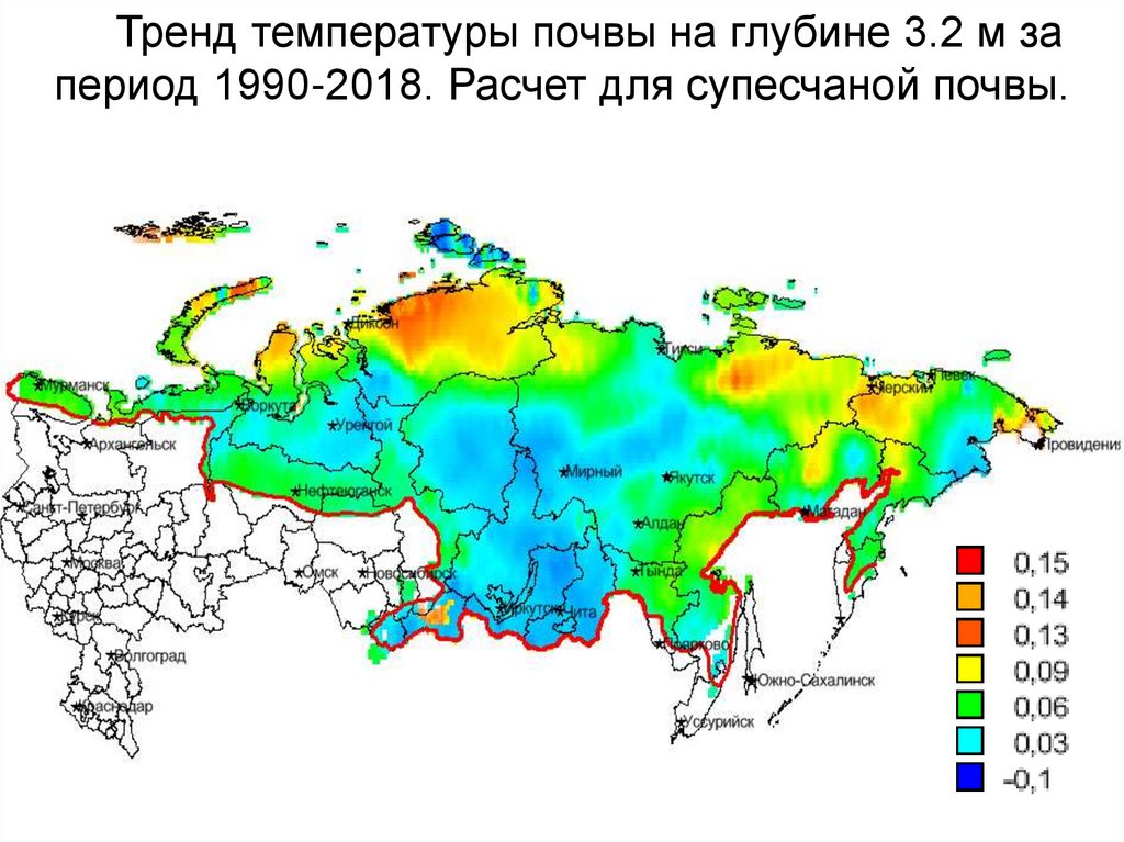 Тренд температуры почвы на глубине 3.2 м запериод 1990-2018. Расчет для супесчаной почвы.