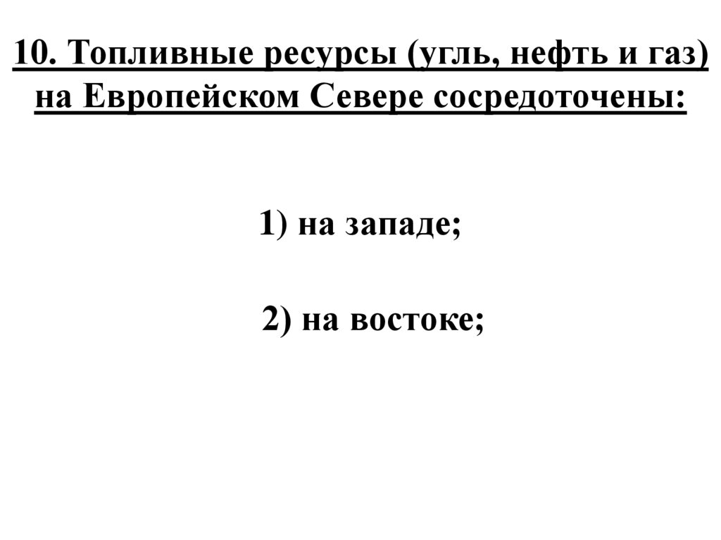 10. Топливные ресурсы (угль, нефть и газ)на Европейском Севере сосредоточены: