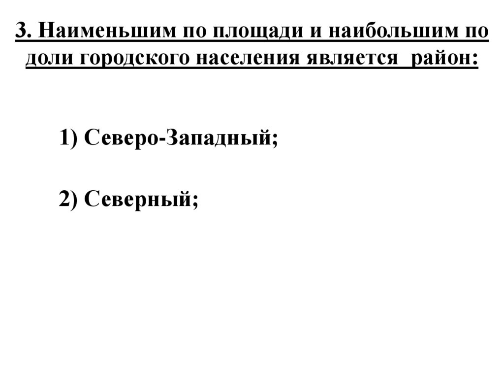 3. Наименьшим по площади и наибольшим подоли городского населения является район: