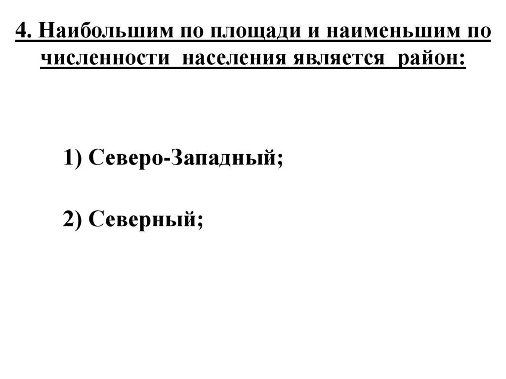 4. Наибольшим по площади и наименьшим почисленности населения является район:
