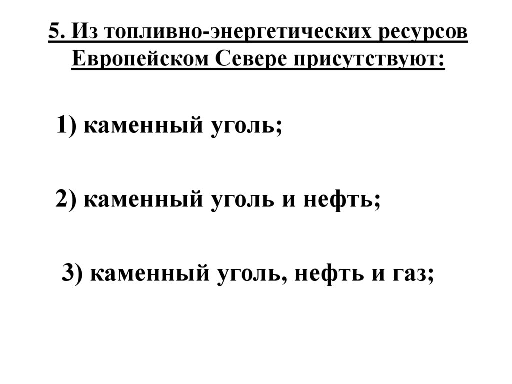 5. Из топливно-энергетических ресурсовЕвропейском Севере присутствуют: