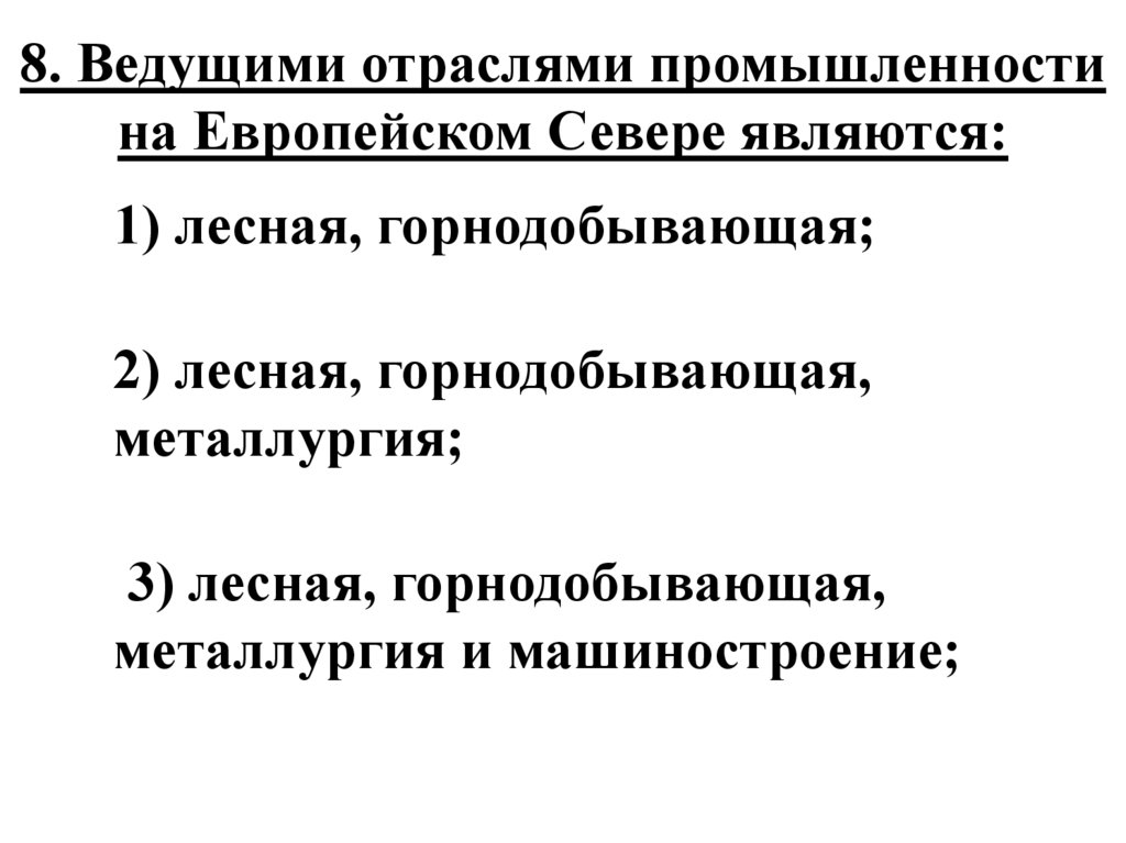8. Ведущими отраслями промышленностина Европейском Севере являются:
