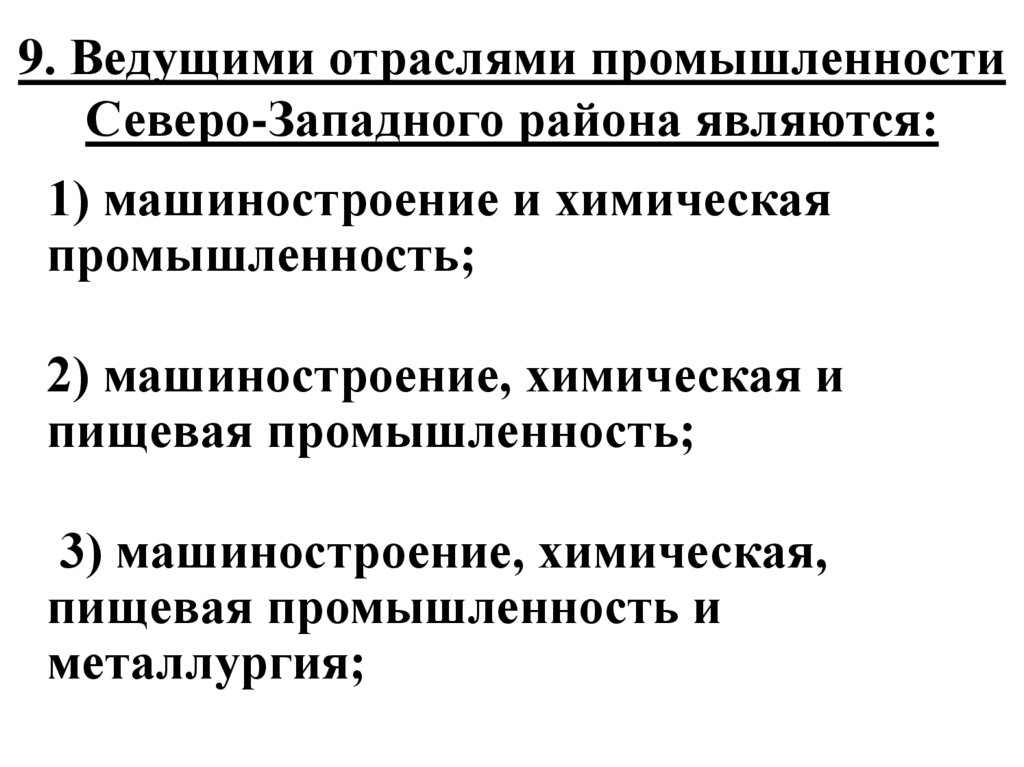 9. Ведущими отраслями промышленностиСеверо-Западного района являются: