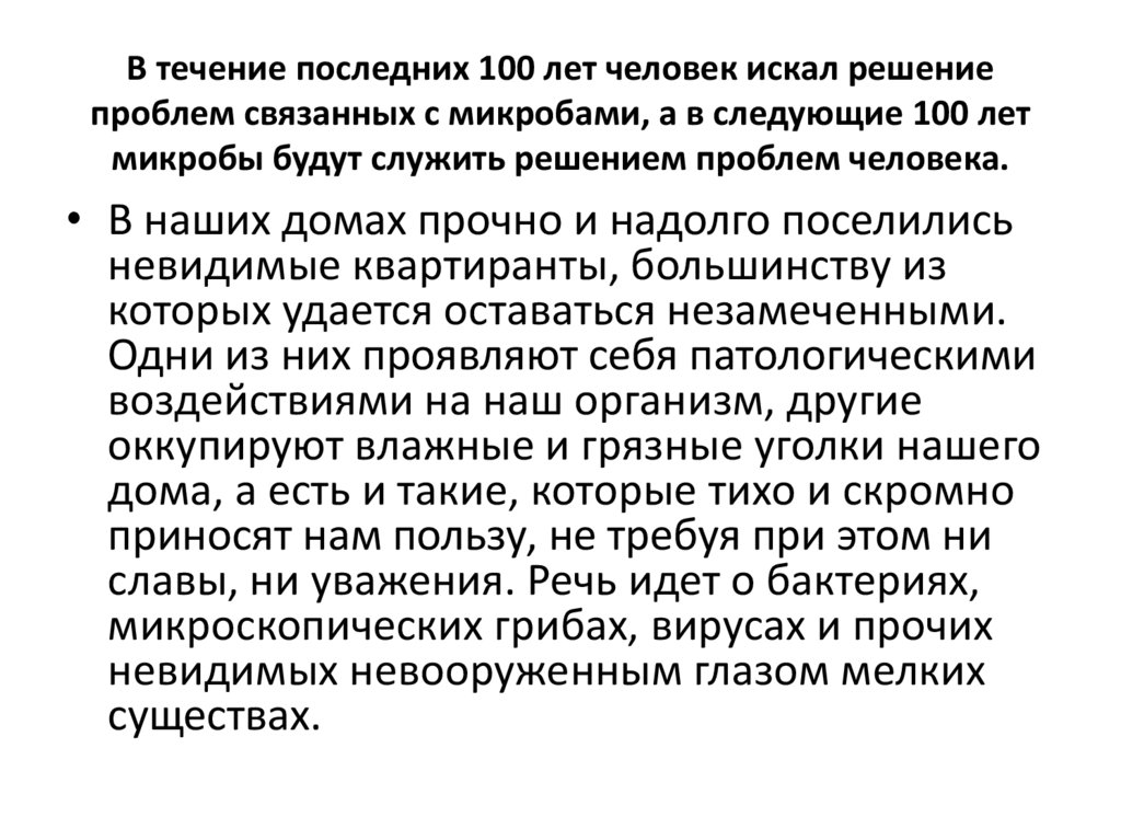 В течение последних 100 лет человек искал решениепроблем связанных с микробами, а в следующие 100 лет