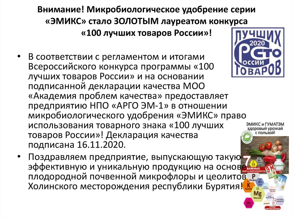 Внимание! Микробиологическое удобрение серии«ЭМИКС» стало ЗОЛОТЫМ лауреатом конкурса