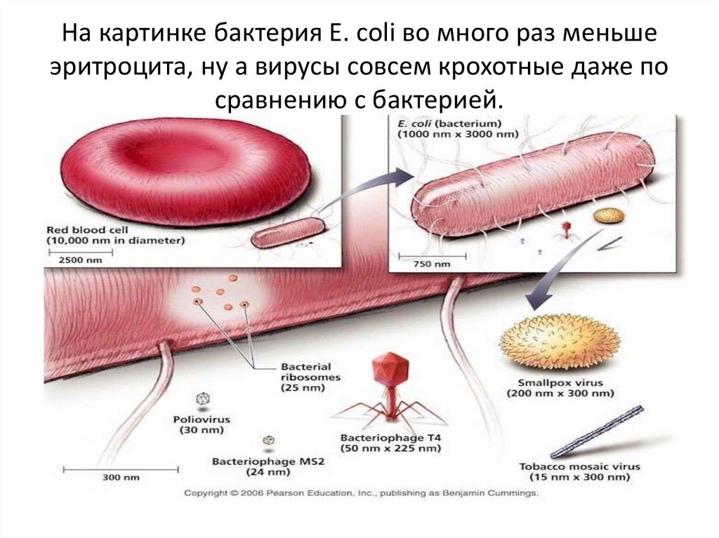 На картинке бактерия E. coli во много раз меньшеэритроцита, ну а вирусы совсем крохотные даже по