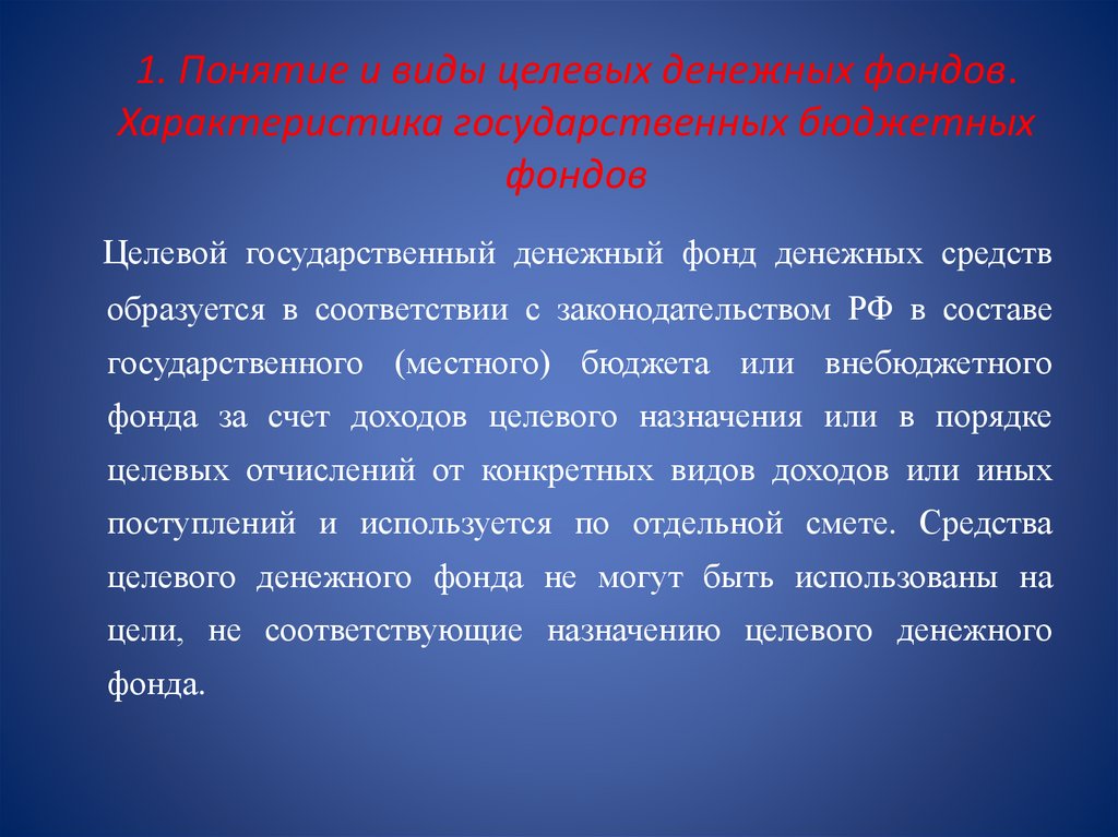 1. Понятие и виды целевых денежных фондов.Характеристика государственных бюджетных