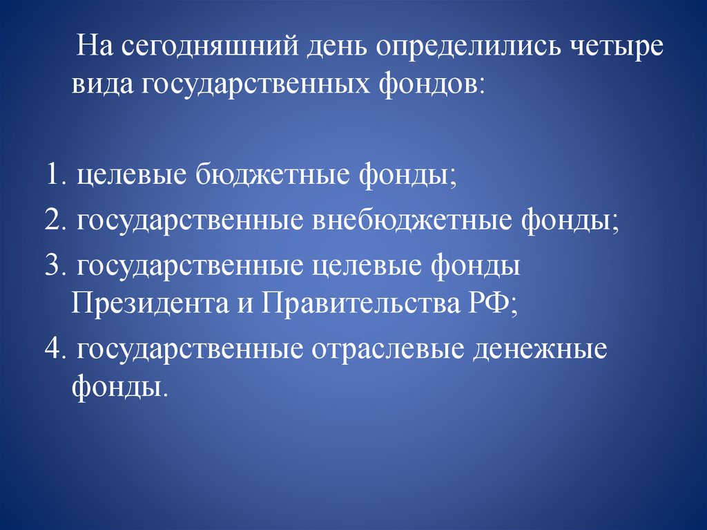 На сегодняшний день определились четыревида государственных фондов: