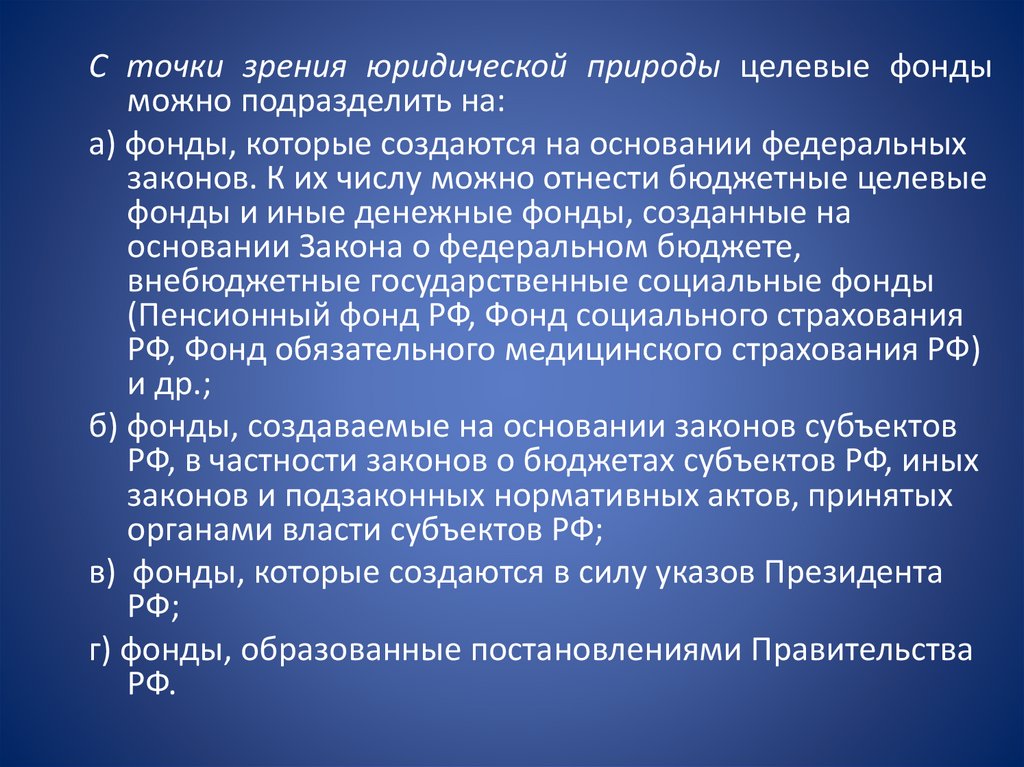 С точки зрения юридической природы целевые фондыможно подразделить на: