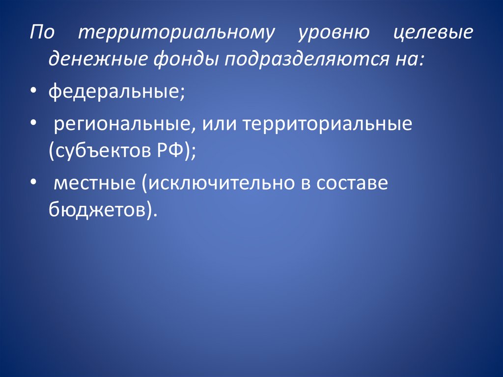 По территориальному уровню целевыеденежные фонды подразделяются на: