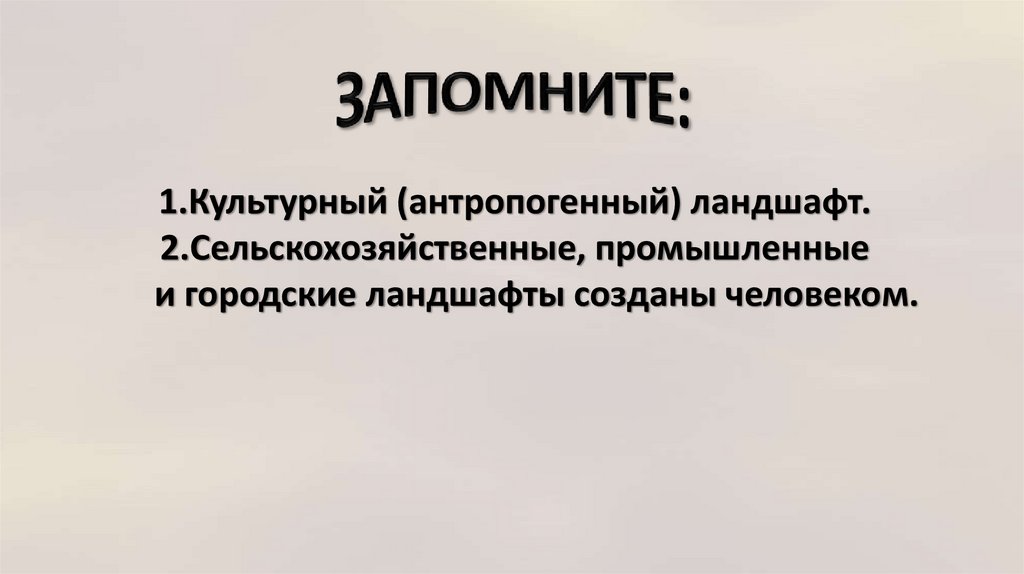 1.Культурный (антропогенный) ландшафт.2.Сельскохозяйственные, промышленные