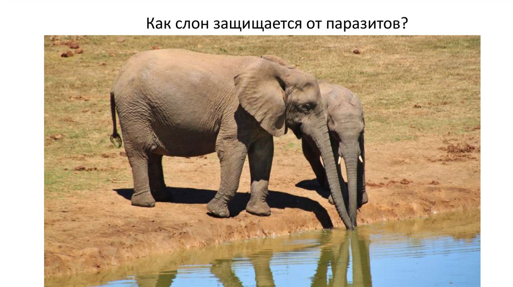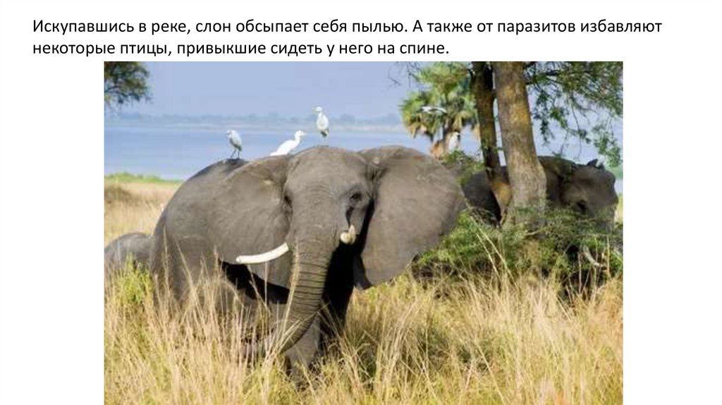 Искупавшись в реке, слон обсыпает себя пылью. А также от паразитов избавляютнекоторые птицы, привыкшие сидеть у него на спине.