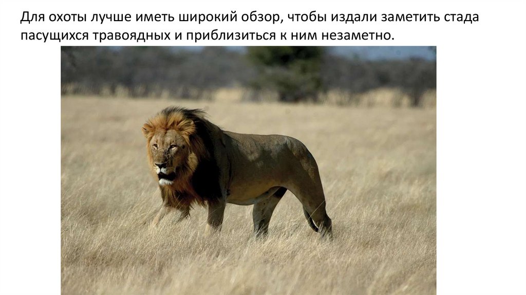 Для охоты лучше иметь широкий обзор, чтобы издали заметить стадапасущихся травоядных и приблизиться к ним незаметно.