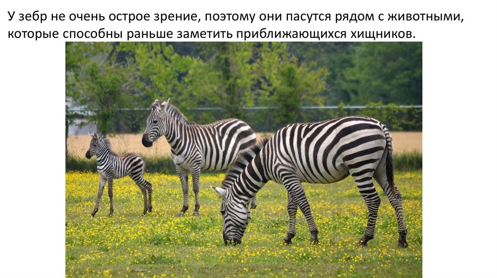 У зебр не очень острое зрение, поэтому они пасутся рядом с животными,которые способны раньше заметить приближающихся хищников.