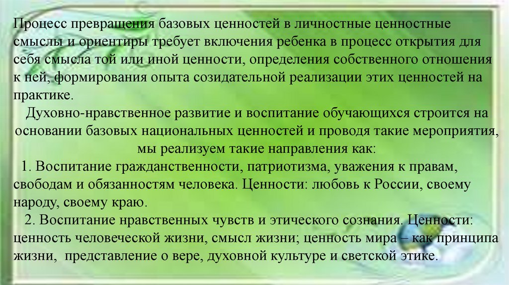 Процесс превращения базовых ценностей в личностные ценностныесмыслы и ориентиры требует включения ребенка в процесс открытия для