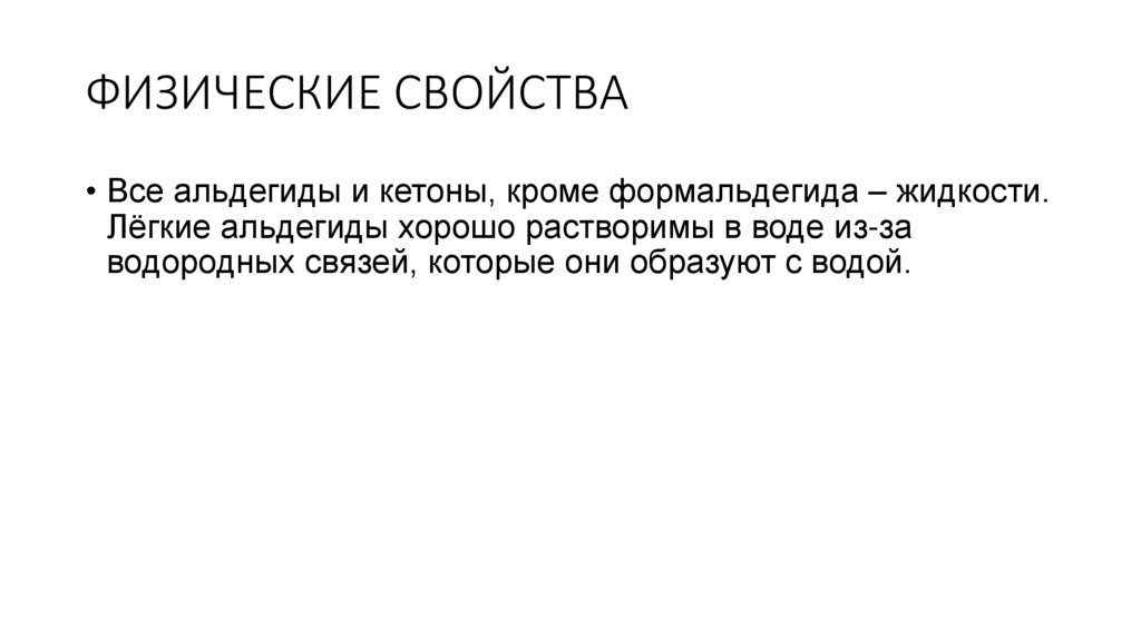 ФИЗИЧЕСКИЕ СВОЙСТВА• Все альдегиды и кетоны, кроме формальдегида – жидкости.
