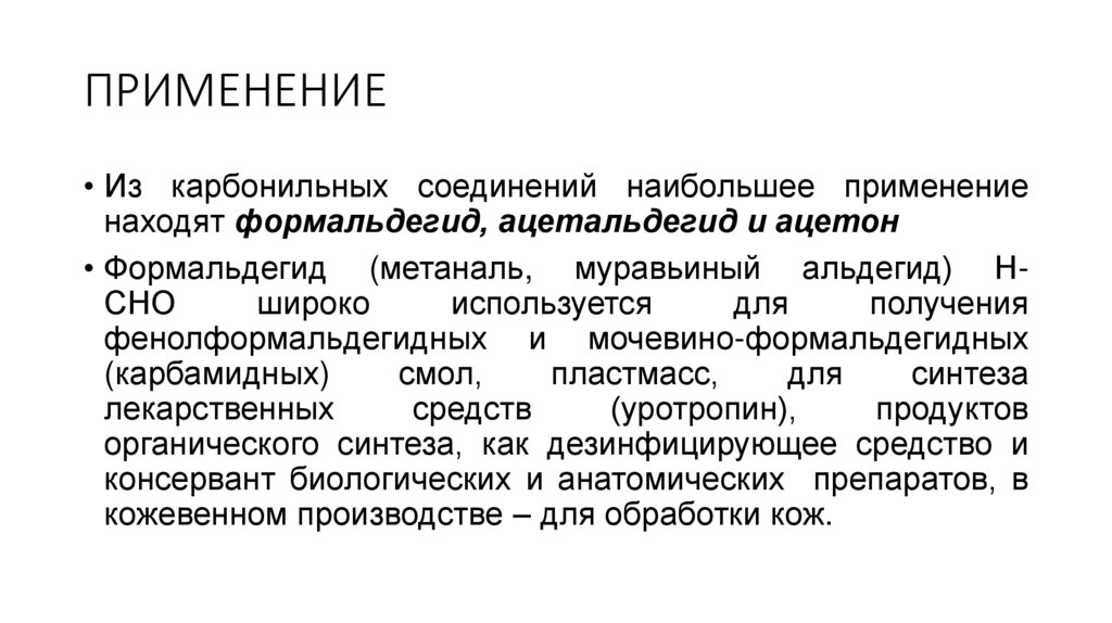 ПРИМЕНЕНИЕ• Из карбонильных соединений наибольшее применение