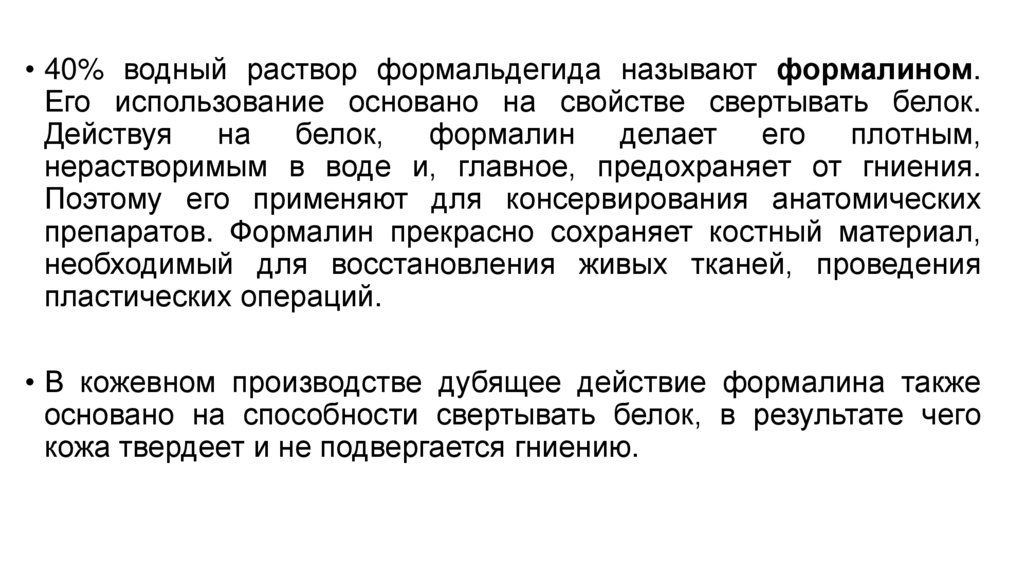 • 40% водный раствор формальдегида называют формалином.Его использование основано на свойстве свертывать белок.
