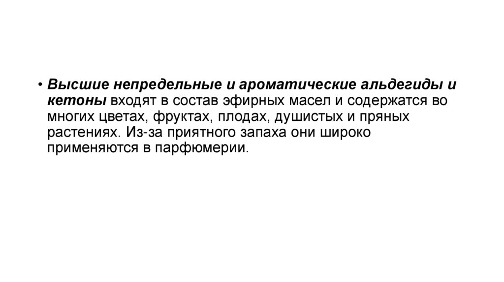 • Высшие непредельные и ароматические альдегиды икетоны входят в состав эфирных масел и содержатся во