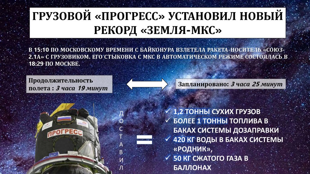 ГРУЗОВОЙ «ПРОГРЕСС» УСТАНОВИЛ НОВЫЙРЕКОРД «ЗЕМЛЯ-МКС»