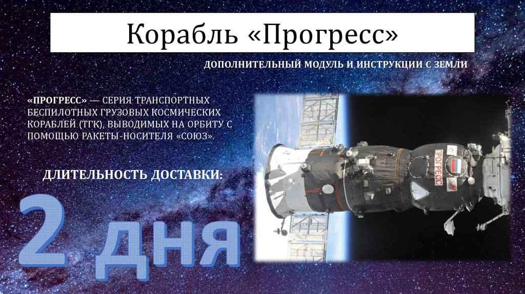 Корабль «Прогресс»ДОПОЛНИТЕЛЬНЫЙ МОДУЛЬ И ИНСТРУКЦИИ С ЗЕМЛИ