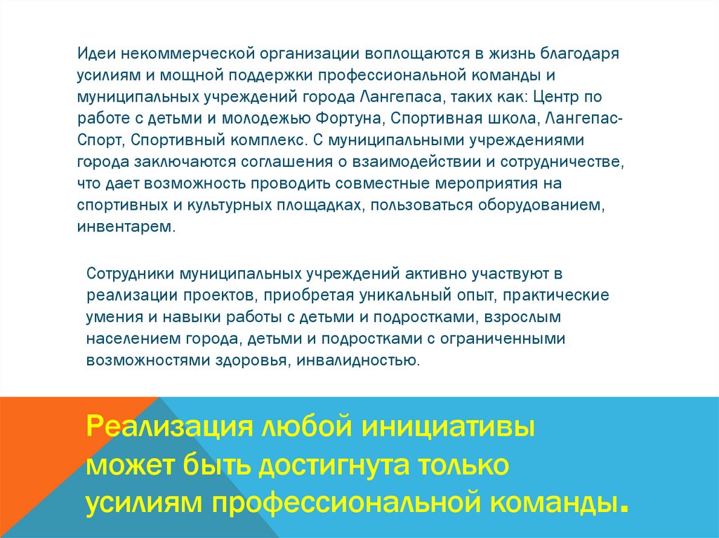 Идеи некоммерческой организации воплощаются в жизнь благодаряусилиям и мощной поддержки профессиональной команды и