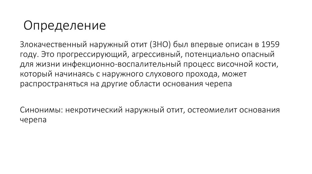 ОпределениеЗлокачественный наружный отит (ЗНО) был впервые описан в 1959