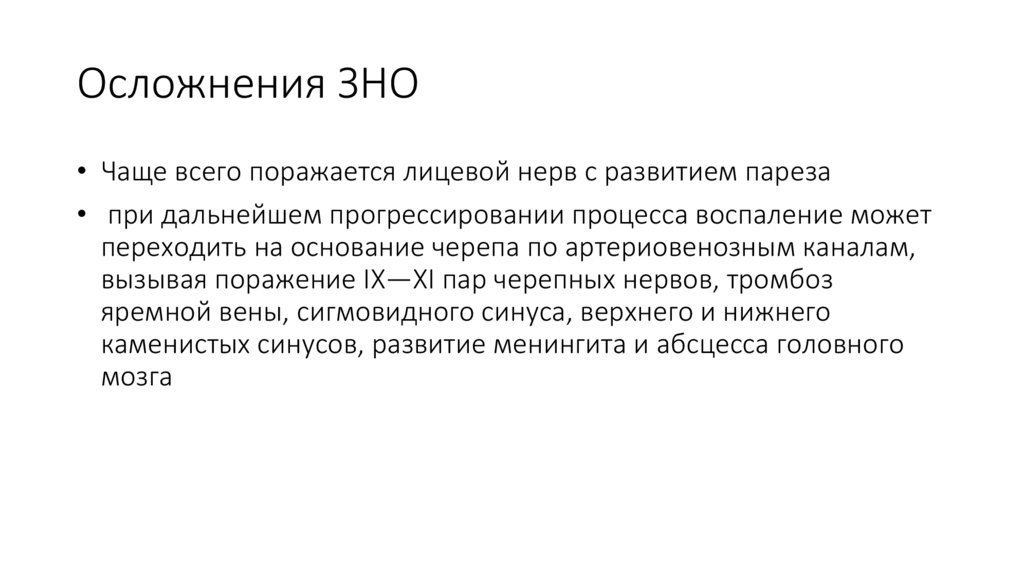 Осложнения ЗНО• Чаще всего поражается лицевой нерв с развитием пареза