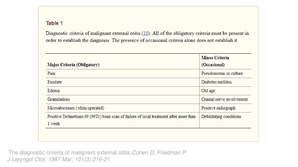 The diagnostic criteria of malignant external otitis.Cohen D, Friedman P J Laryngol Otol. 1987 Mar; 101(3):216-21.