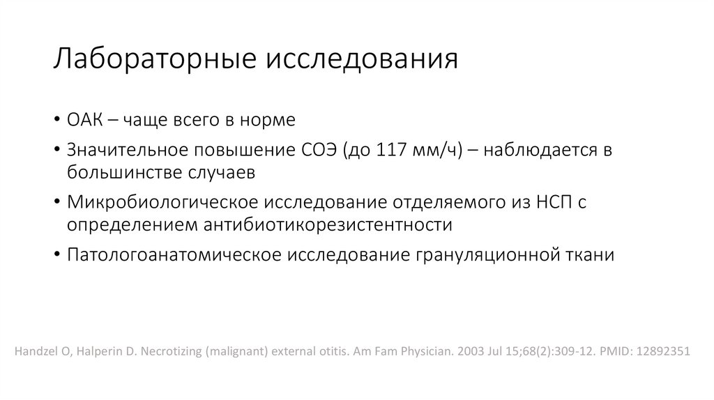 Handzel O, Halperin D. Necrotizing (malignant) external otitis. Am Fam Physician. 2003 Jul 15;68(2):309-12. PMID: