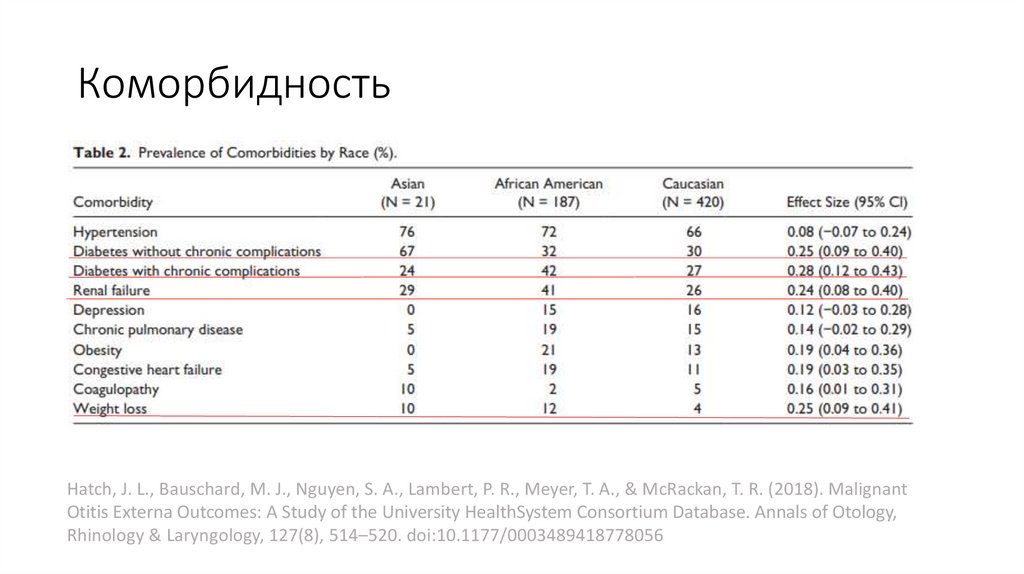 КоморбидностьHatch, J. L., Bauschard, M. J., Nguyen, S. A., Lambert, P. R., Meyer, T. A., & McRackan, T. R. (2018). Malignant