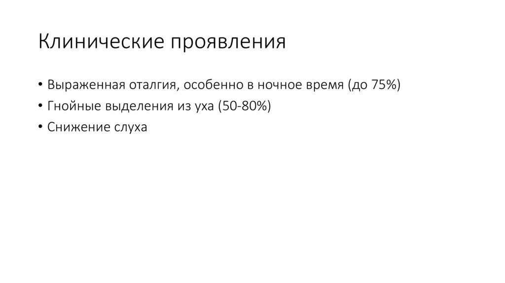 Клинические проявления• Выраженная оталгия, особенно в ночное время (до 75%)